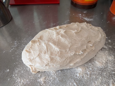 5. After this I usually knead the dough for a few more minutes by hand, folding and stretching the dough. Kneading the dough is an important step because it develops the gluten that ensures the bread gets airy light and develops it shape. If any of the dough sticks to your hands, just rub them together with a little extra flour.