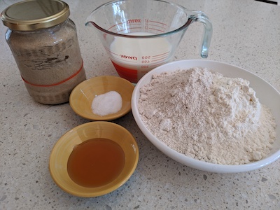 - Make sure you have taken your Sourdough Starter out of the fridge and feed it well to activate. Mix flour and water in a large bowl and let it autolyse for about an hour.