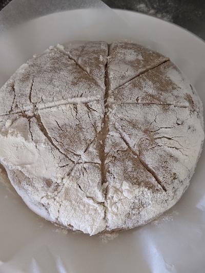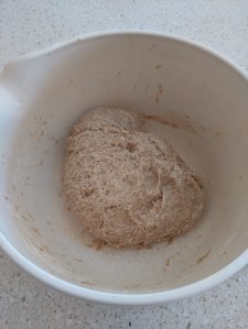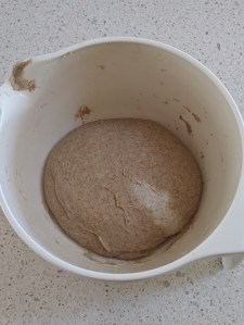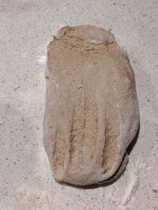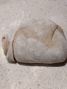 5. Dump the dough onto a lightly floured bench top. Flatten the dough and form it into the shape you prefer, a bâtard or boule. You can also shape your dough in a banneton or colander lined with a towel. Cover the dough and let the dough rise until it passes the finger poke test. When you poke the dough it should bounce back in shape. This can take a few hours depending on your ambience. The dough will rise, but not as much as when you are baking a wheat based bread. Don’t worry the bread will rise further when you bake it.