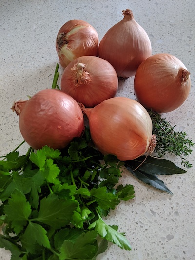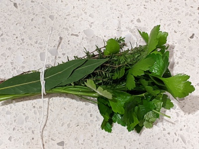 • 4 thyme sprigs, some parsley stalks, 2 fresh bay leafs, combined into a bouquet.
