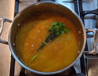 2. Slowly add the rest of the stock, the bouquet and simmer for 45 minutes.