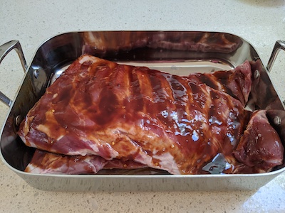 Preheat the oven to 140c. Put the ribs in an oven proof dish, brush all the marinade on top, cover the dish with foil and put it in the oven for 3-4 hours. After this time the meat should be soft and tender, almost falling off the bone.