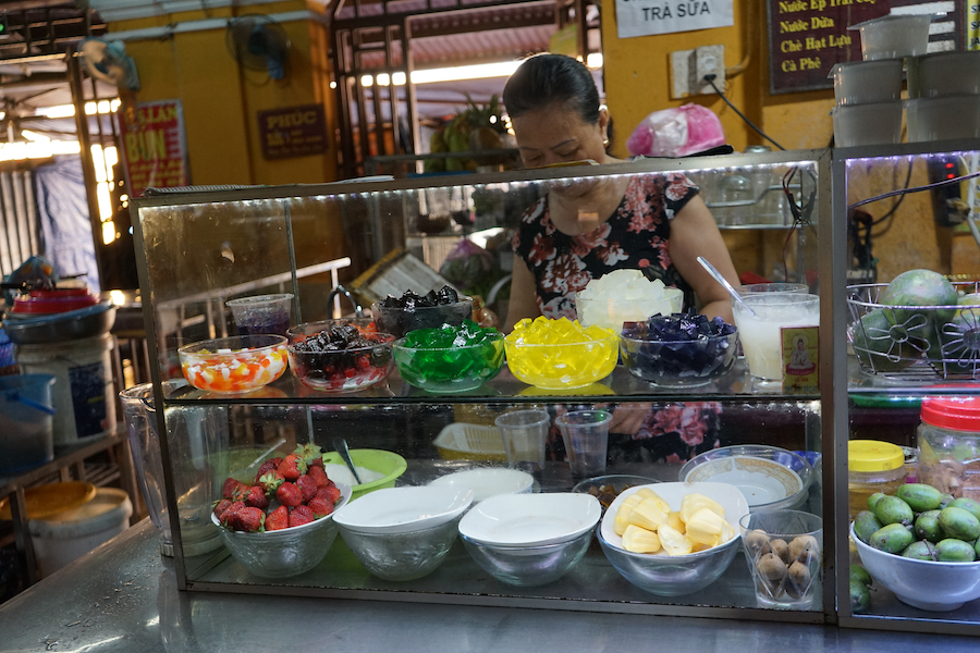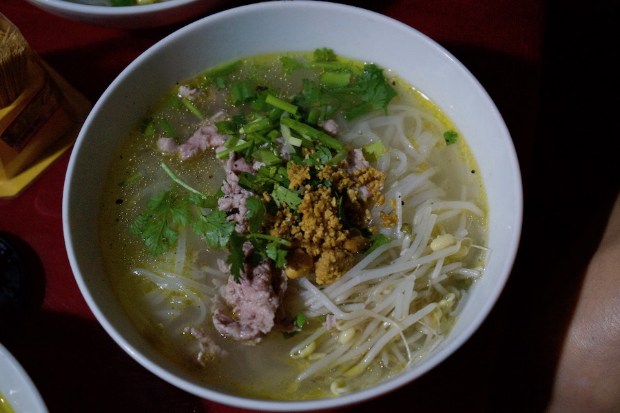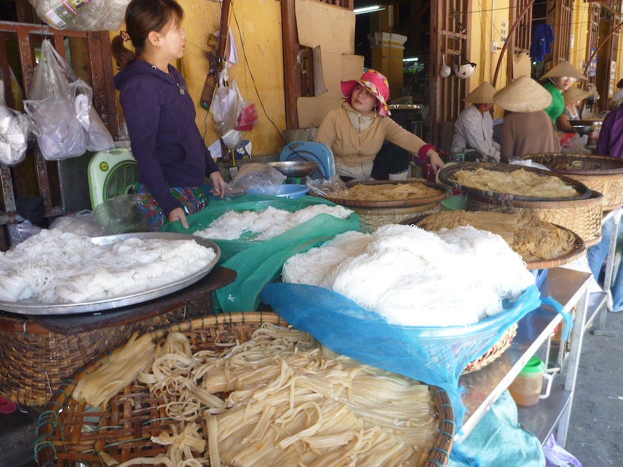 The market hall is divided into 4 sections. The section closest to the open market area is dedicated to fresh meat and start and finish a little later than the meat section in the covered area. You will also find the best noodles sold here, colourful variations to please the eye. The middle part of the market hall is dedicated to little shops selling household articles, incense, tea and herbs. These little shops are open till the afternoon, locking up their wares at night. The market section furthest away from the water is my favourite spot for breakfast and lunch. This is where you find food stalls, usually specialised in one or two dishes only. Sit-down with the locals and enjoy a Hoi An special “Cao Lau” Noodle, Vietnamese coffee or fresh salad, prepared right in front of you.