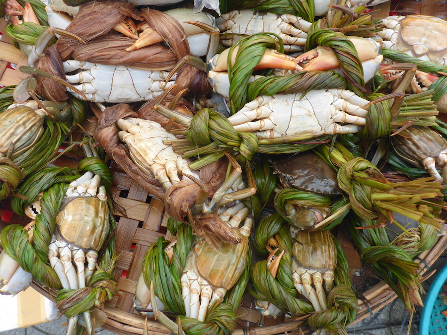 The covered market area, closest to the water side is where it is the liveliest. Fresh means fresh, fish is brought in by small boats and sold directly on the water’s edge. Big blocks of ice are caried in to keep the fish fresh and don’t be surprised when some species are still flipping their teals. The fish mongers are working hard to sell there produce quickly. Be respectful when you walk around and remember that this is their daily job. Other parts of the covered area are reserved for fresh meat, eggs and live birds. You will find all sorts of cuts, and in good Asian tradition all parts of the animal are sold for consumption. This is the part of the market where you need a strong stomach, but if nothing else, it is a good eye-opener for your kids too.