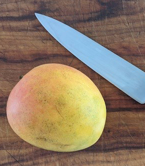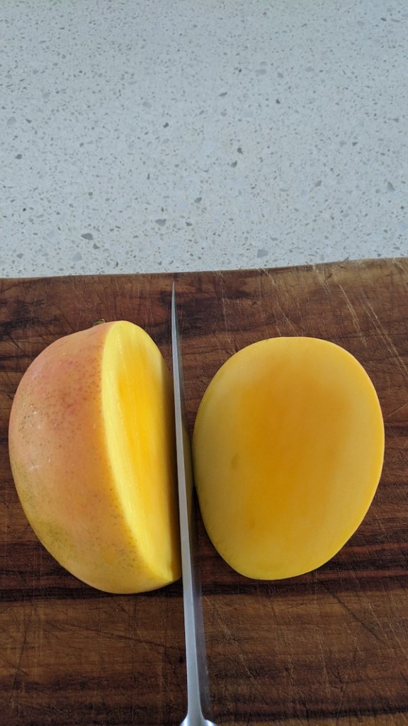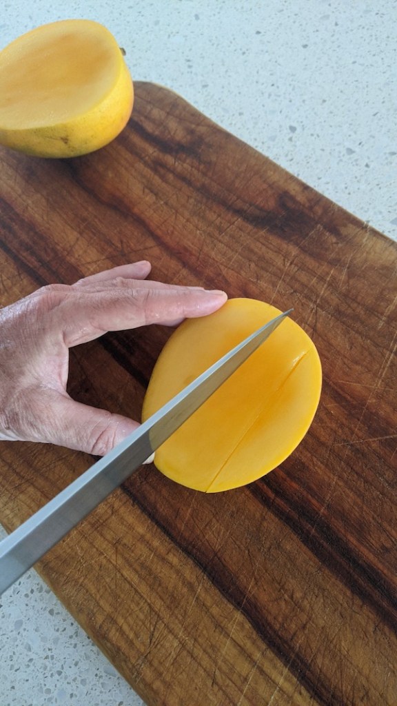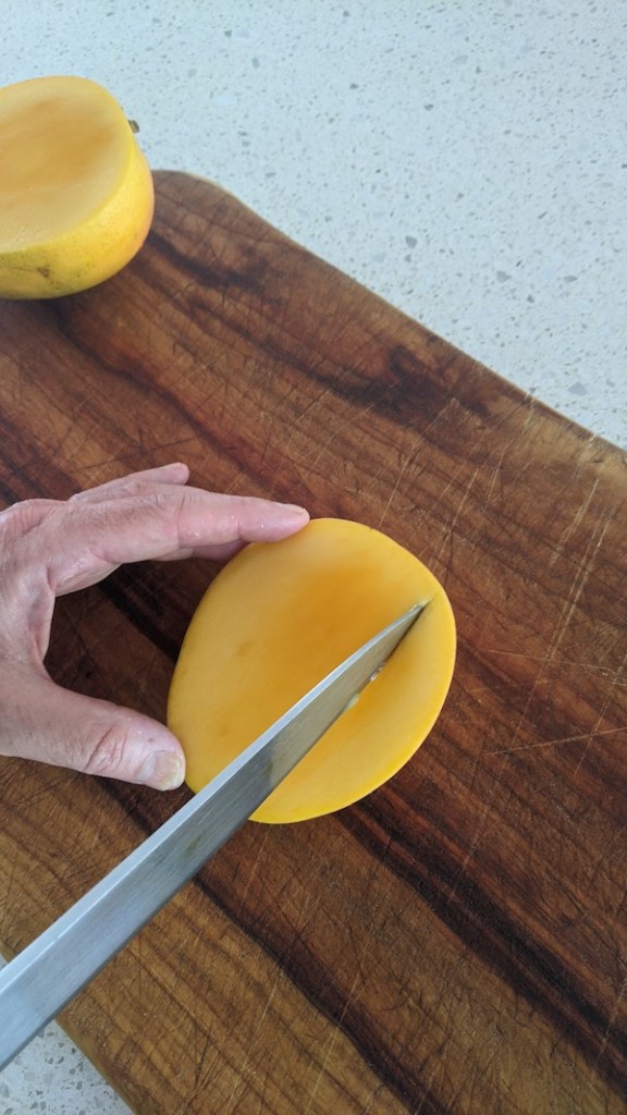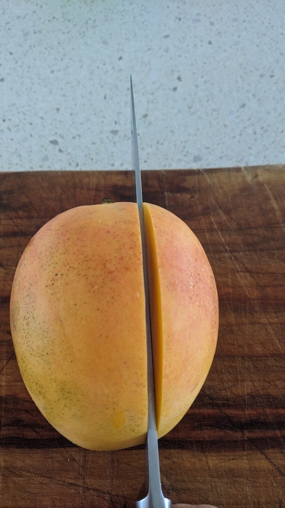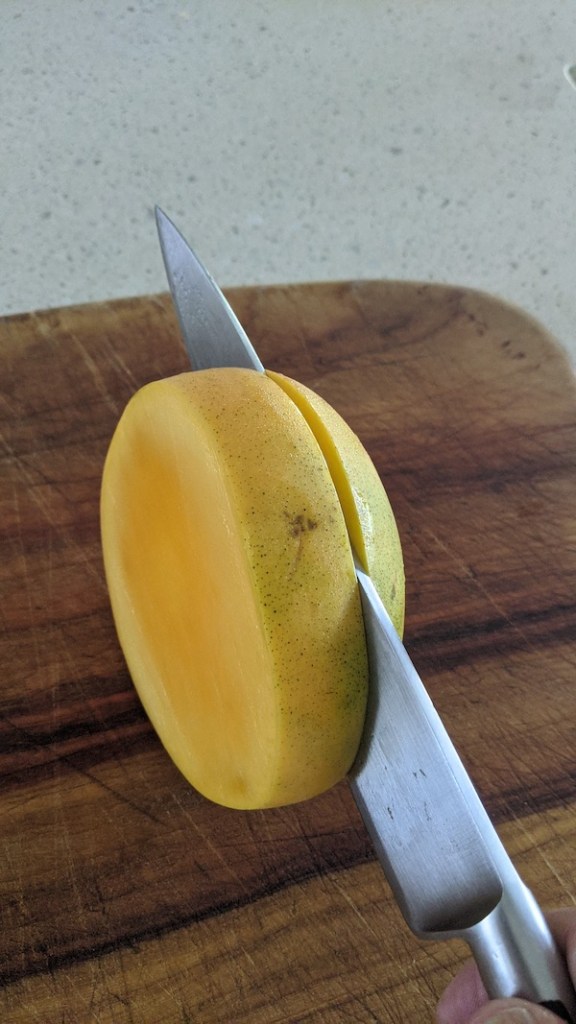 Cut away the Mango cheeks. The Mango has a flat-ish oblong pit in the centre, and you want to cut around that. The pit follows the shape of the Mango itself, so you place the Mango on its smaller side, the side it wants to roll off when you don’t hold it. It’s best to cut from the widest and more flat sides of the mango first to obtain the most flesh.