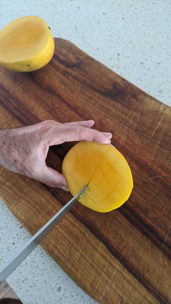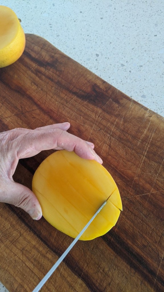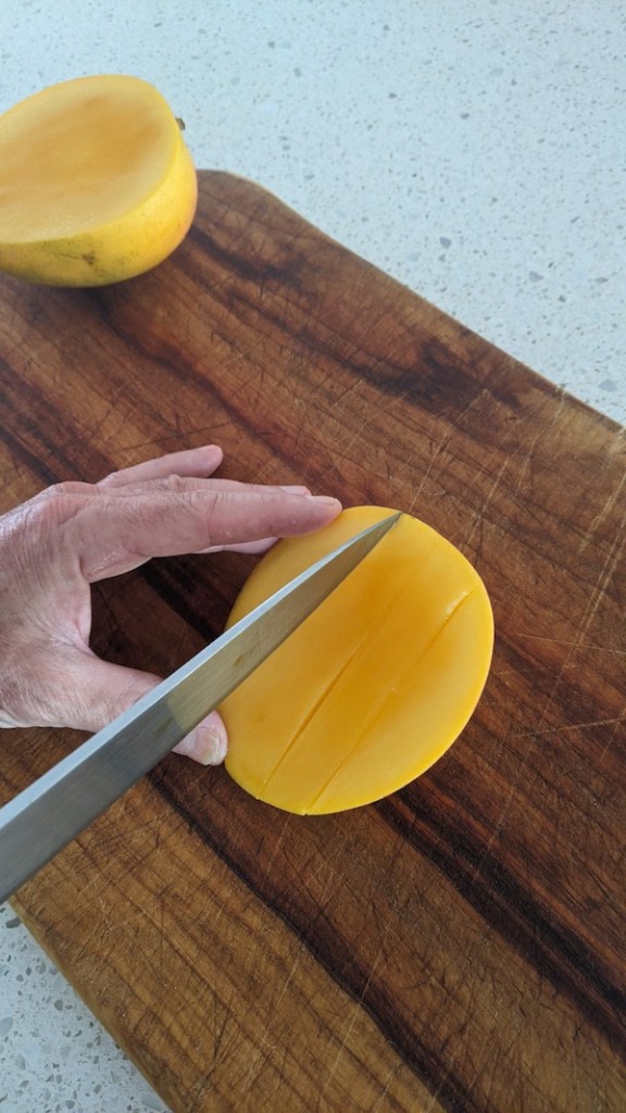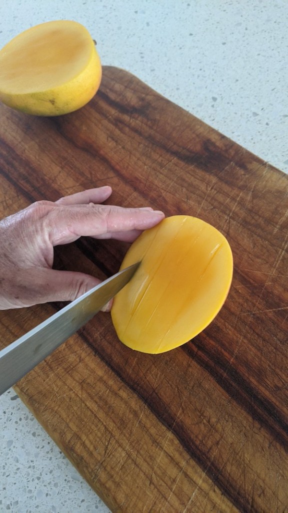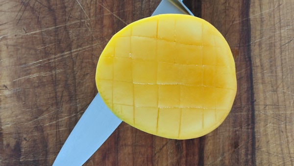 Scoring the flesh. You want to create a grid, by making slices in the Mango cheeks, but not all the way trough. You push the point of your knife into the flesh until you feel the skin and start running the knife without cutting the skin. Hold the cheek with one hand and run the knife with the other. Turn the Mango 90 degrees and create a grid.