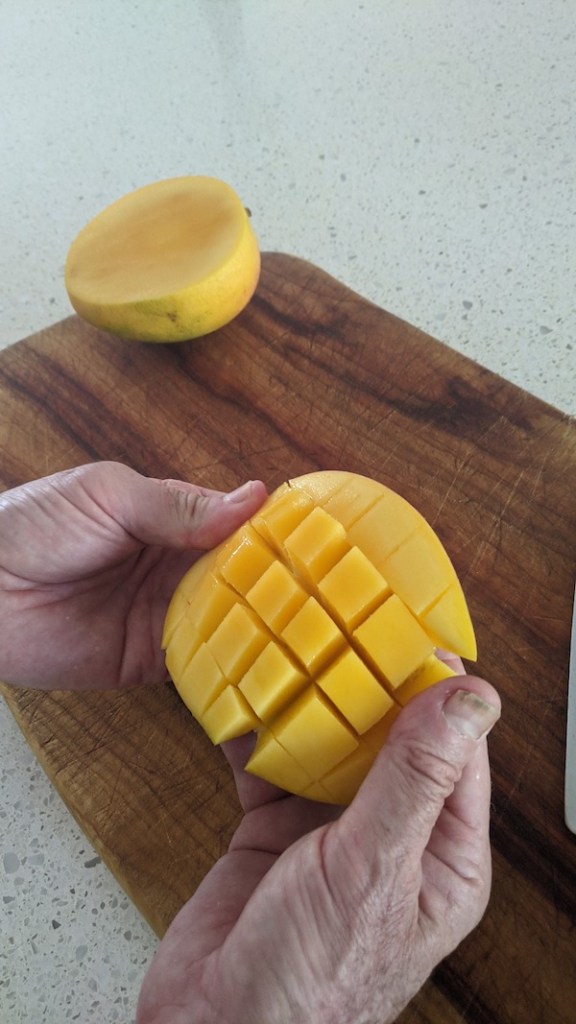 Once you have created your grid, take the cheek into your hands and push the flesh inside out. Use your fingers to push the flesh up and use your thumbs to push the sides of the cheeks down. Alternatively you can scoop out the cubes if you use them in a salad or something, but we love the fun of eating them of the skin.